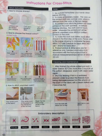 【The Package Contains】Pre-printed embroidery cloth ×1, Needle×2, All color threads, Description ×1, Drawing ×1