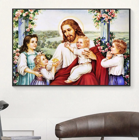 60x40cm Jesus and the children Cross Stitch Kits 11CT Stamped Full Range of Embroidery Starter Kit for Beginners Pre-Printed Pattern