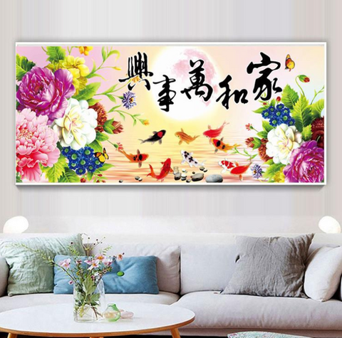 149x66cm Peony and Nine Fish Cross Stitch Kits 11CT Stamped Full Range of Embroidery Starter Kit for Beginners Pre-Printed Pattern