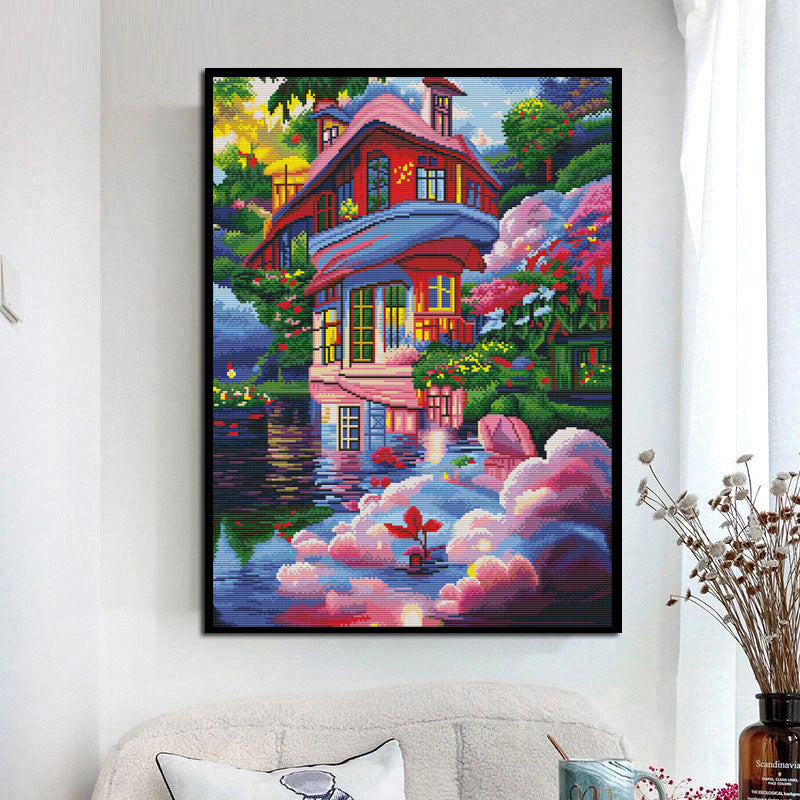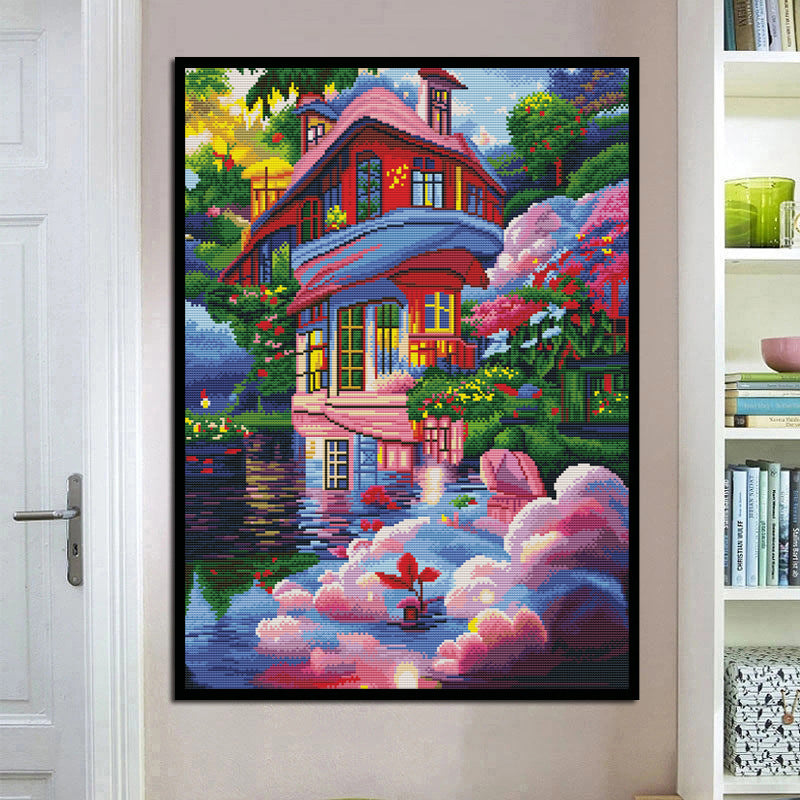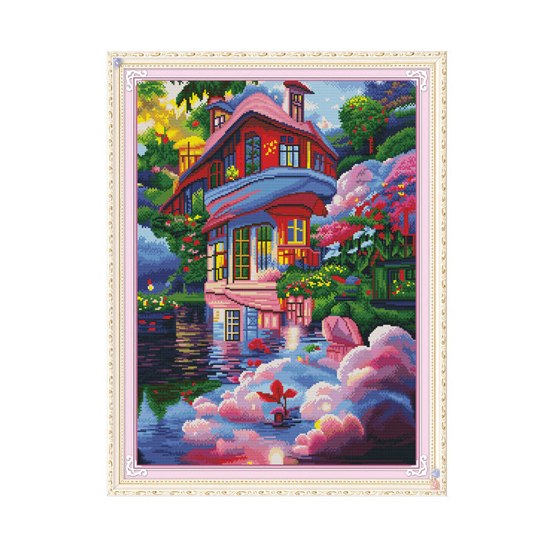53x70cm Pink Dream House Cross Stitch Kits 11CT Stamped Full Range of Embroidery Starter Kit for Beginners Pre-Printed Pattern